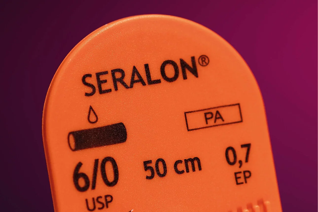 Seralene® is a non-absorbable suture material with a smooth surface for tissue passage. Thus, it is particularly applied in vascular surgery, for which there is a special delivery programme.